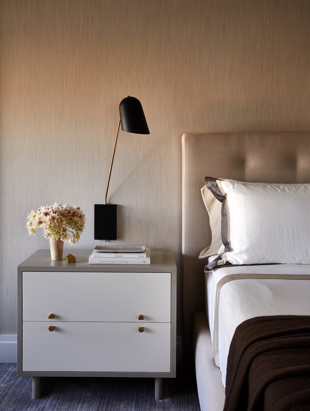 The master bedroom is a textural delight, even in neutral shades. Grasscloth effect wallpaper adds to the overall aesthetic and matching blinds create a seamless look. The room is large and airy, extending onto the balcony and inviting the outdoors in.