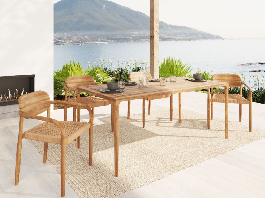 For a natural ambience full of elegance, durability and quality: the SOLE MIO chairs with armrests and wickerwork and the BELLA table made of solid, oiled teak.