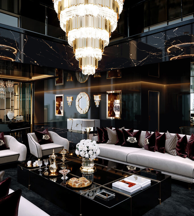 Located among the amazing landscapes of Dubai, this enticing apartment was conceived to please a high calibre VIP, whose brief was to create a dramatic statement reception area, with a masculine feel combined with some soft touches.