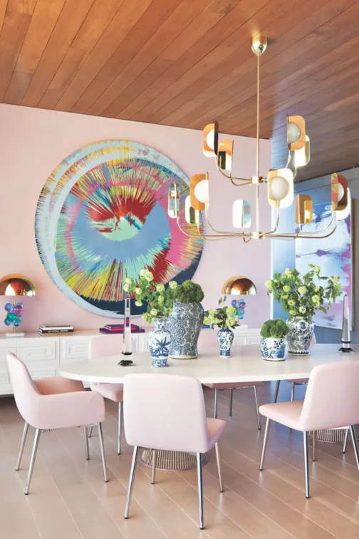 We’re in love with the interior design that was chosen for the modern dining room. The painting belongs to Jeff Koons, who’s aligned perfectly with a Donald Lipski light. The last one was embellished with some Swarovski crystals.