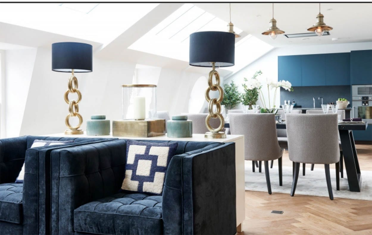A palette of deep blues, white, beige and hints of metalic finishes add freshness and modern appeal to this stylish apartment, a project completed with the Stonehaven Group. Here, the Maxima 2.2 kitchen from Cesar was selected. A custom colour lacquer finish with titanium profiles and plinths adds to the luxury tone of this space. Worktops and splash backs are done in honed Lavastone and the kitchen boasts beautiful Gaggenau appliances for a contemporary look.