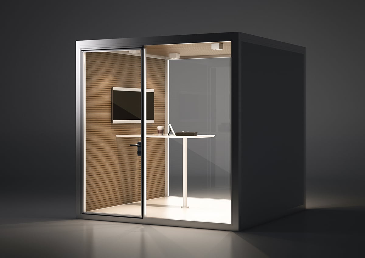 The walls of each room are fitted with a layer sound-absorbing mineral wool, as well as fire-resistant wooden slats, while the exterior is finished with vertical melamine or fabric covered panels. Doors are made from high-quality insulated glass, helping to further soundproof the cubicles. The interior is pleasing, and the furniture installed inside provide a general sense of comfort and privacy.